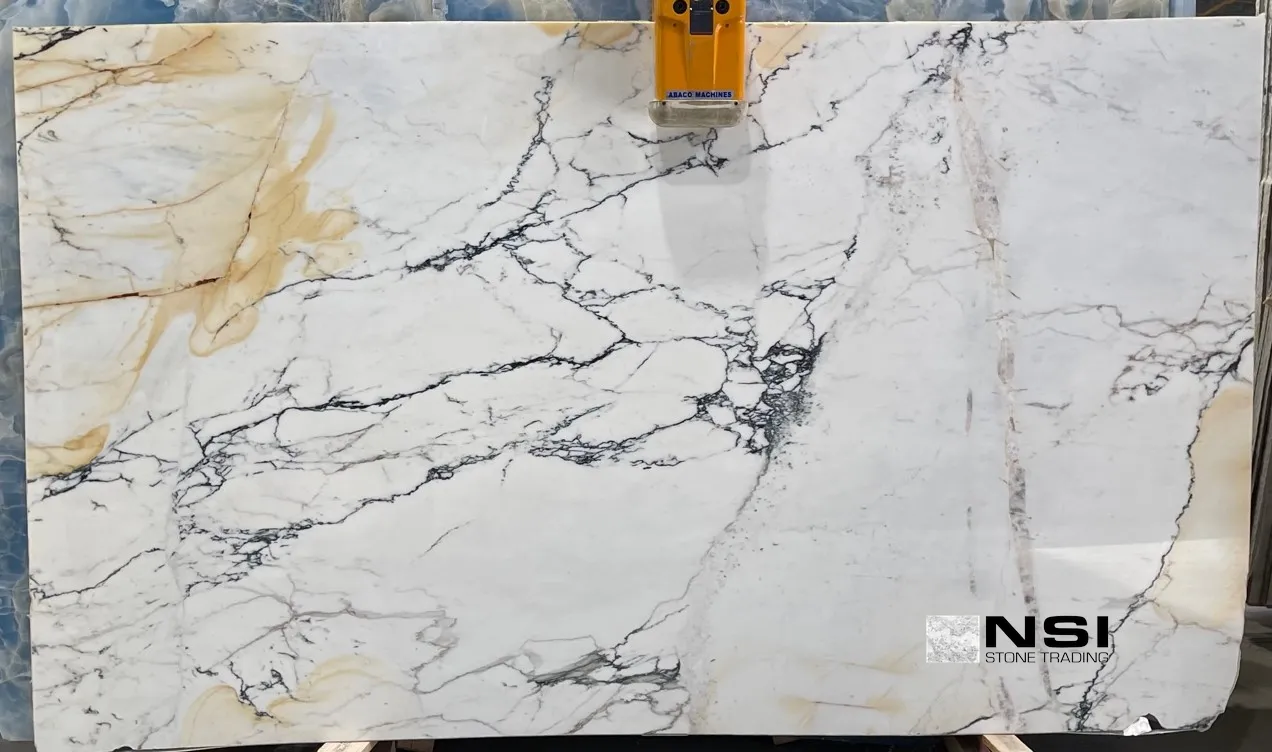 Color: The primary color of CALACATTA PAONAZZO 2CM marble is white, complemented by striking gold veining. The gold streaks add a touch of luxury and sophistication.