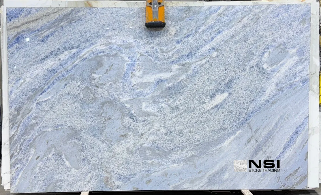 ICEBERG BLUE Quartzite is a stunning natural stone known for its durability and unique appearance. This quartzite features a blue background, subtly infused with intricate white veining and occasional grey tones, creating an elegant and modern aesthetic. It is an ideal choice for high-end applications due to its hardness and resistance to heat and scratches.