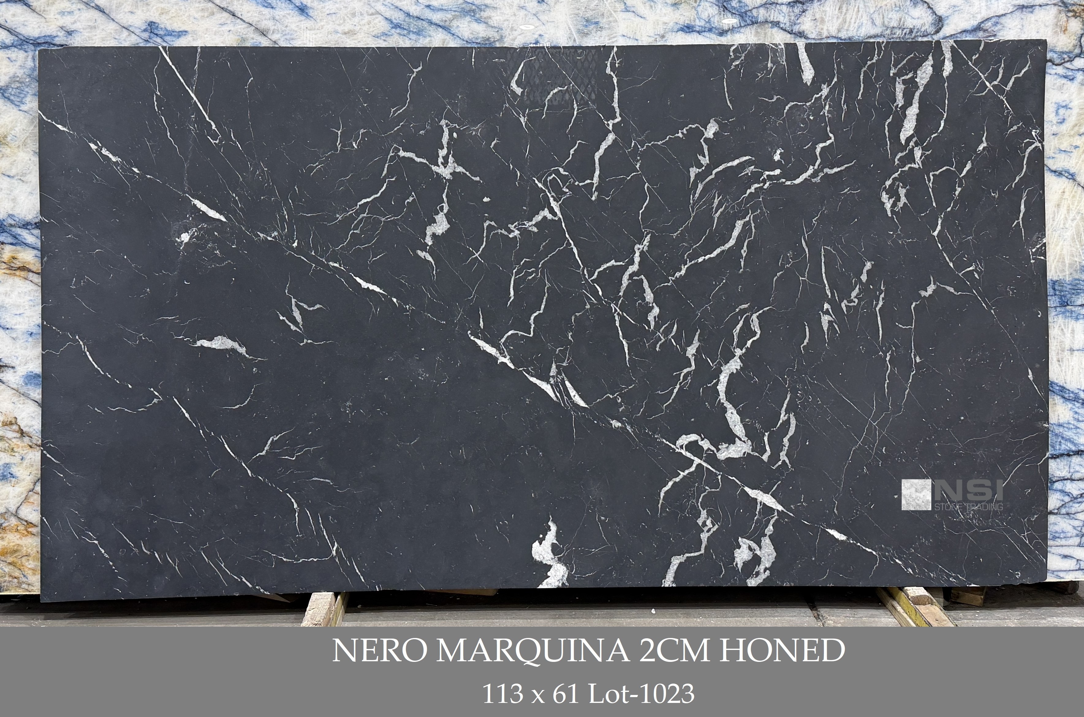 NERO MARQUINA 2CM Honed Marble is a remarkable natural marble known for its stunning appearance and high-quality finish. This marble features a black background, subtly infused with white veining, creating a bold and elegant look. It is an ideal choice for a range of applications including bathrooms, kitchens, living rooms, and bookmatch walls and floors.