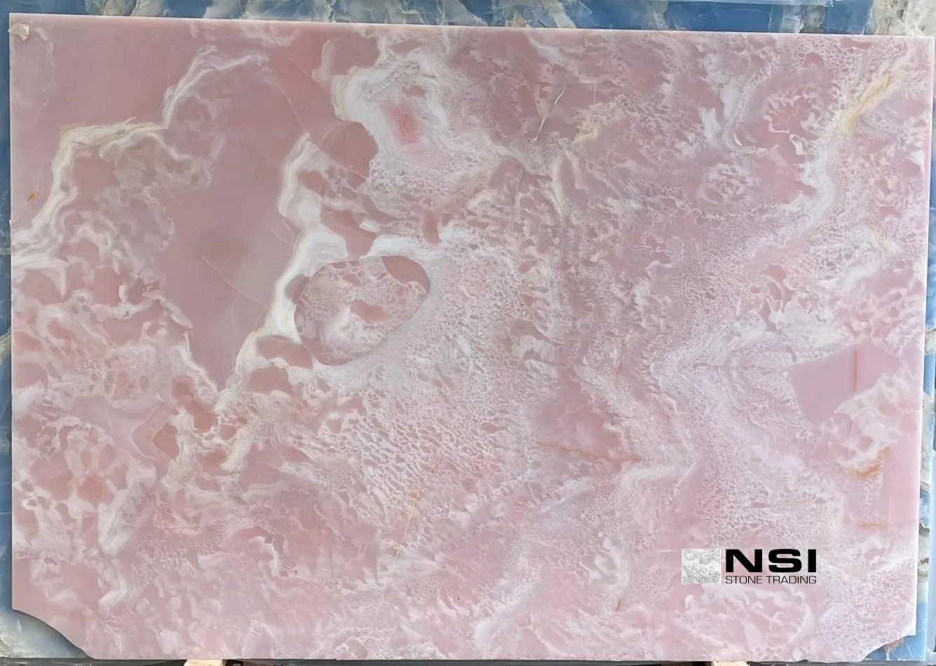 PINK ONYX 2CM natural stone is an exquisite, luxurious onyx material featuring a soft pink background. This stone, mined from the rich quarries of Mexico, is renowned for its beauty and unique characteristics. The polished finish enhances its natural luster, making it an excellent choice for high-end interior applications. The pink hues are interspersed with delicate veining and subtle color variations, creating a breathtakingly elegant appearance. It is ideal for statement pieces and areas where its beauty can be showcased.