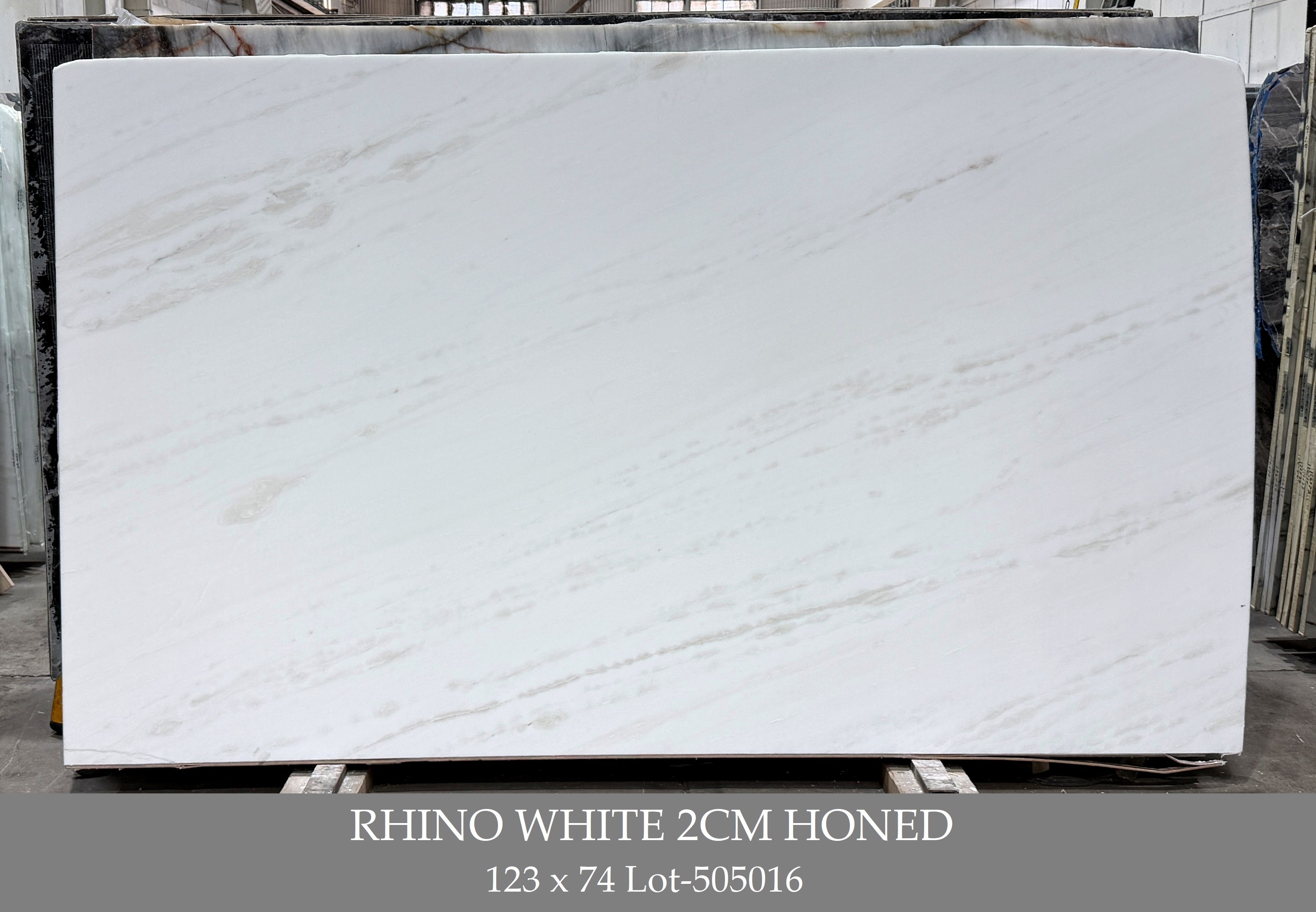 RHINO WHITE 2CM Honed Marble is a stunning natural stone known for its elegance and timeless beauty. This Marble features a pristine white background, subtly infused with delicate grey veining, creating a sophisticated look perfect for any luxurious space. It is an ideal choice for a variety of interior applications, such as kitchen countertops, bathroom vanities, and wall cladding.