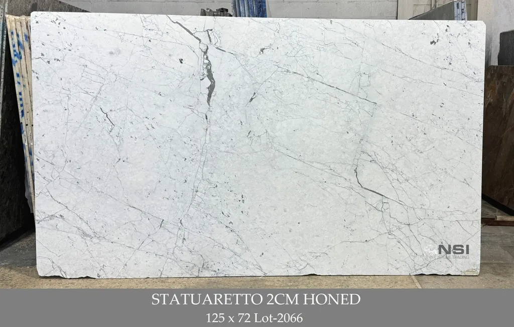 STATUARIETTO 2CM HONED marble is a luxurious stone renowned for its elegant and sophisticated appearance. This marble features a pristine white background, delicately infused with subtle grey veining, creating a timeless tone of elegance. It is an ideal choice for a variety of indoor applications, including bathrooms, kitchens, hallways, living rooms, and bookmatched walls.